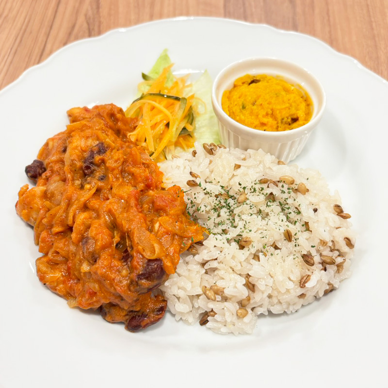 数種類のスパイスをブレンドし、香りを引き出してからじっくりとトマトで煮込みました。食物繊維たっぷりのレッドキドニーを加え、一皿でたんぱく質、ビタミン、食物繊維がバランス良く摂れる一皿です。