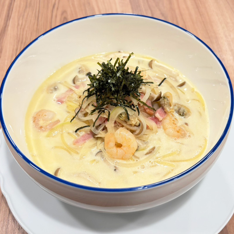 鉄分豊富なあさりとプリプリのエビ、食物繊維豊富な しめじを使用し、海の幸と山の幸の旨味が溶け合う和風スープ仕立てのスパゲッティです。