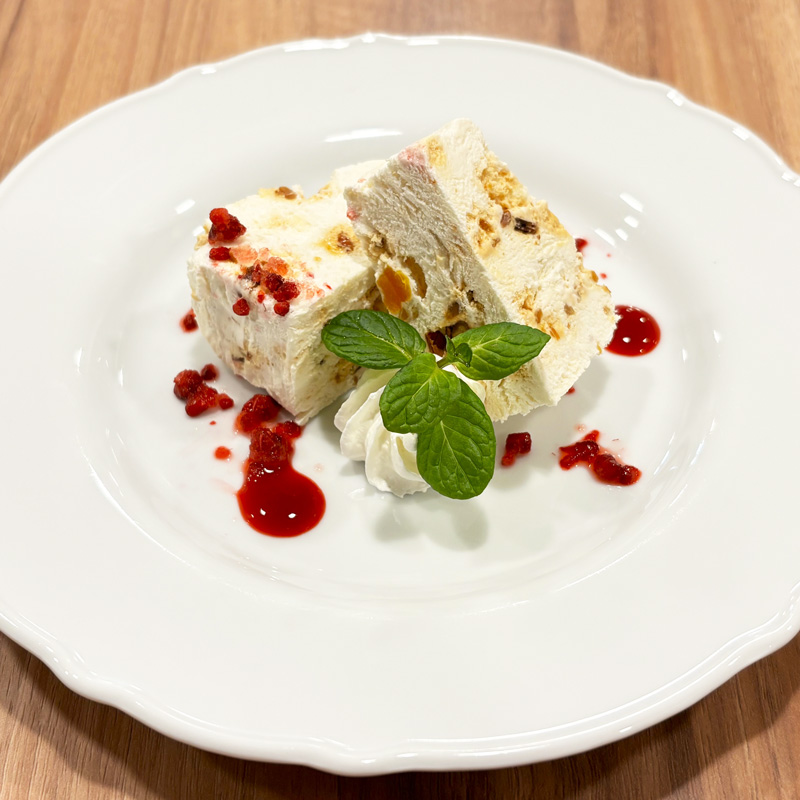キャラメリゼした香ばしいナッツと、ラム酒に漬けたドライフルーツが入った冷たいメレンゲスイーツです。