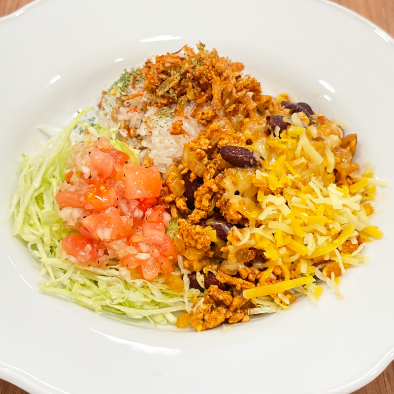 ほんのり甘みのある豆とピリ辛スパイスが絶妙!ヘルシーな鶏ひき肉と食物繊維やたんぱく質など多くの栄養素豊富に含むレッドキドニービーンズを使用しています。