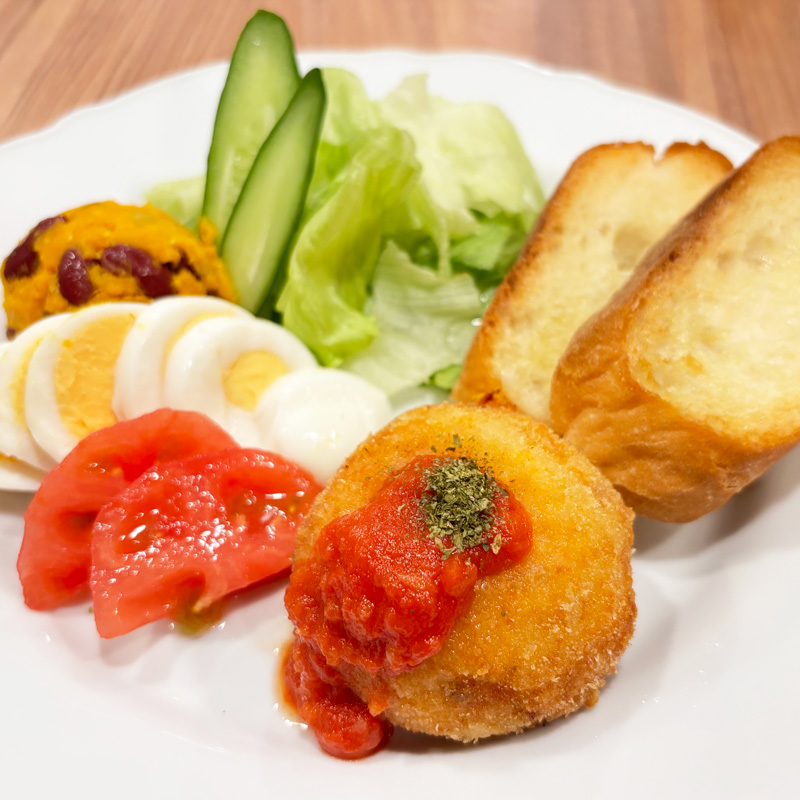 トマトソースをまとったアランチーニに、ビタミンと食物繊維が豊富なかぼちゃ、鉄分が豊富なレッドキドニーのサラダ、フレッシュな野菜を添えました。ほんのり甘いかぼちゃのサラダは、ガーリックトーストにのせて食べるのもおすすめ!一皿で楽しめる彩り豊かなワンプレートです♪