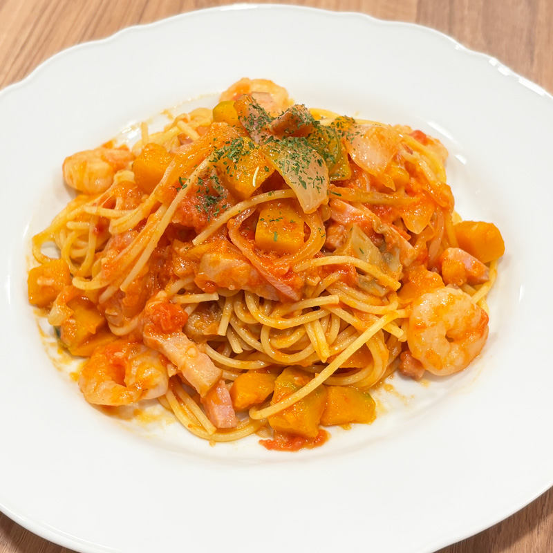 かぼちゃのビタミンと食物繊維、トマトのリコピンをたっぶり摂れるソースです◎べーコンと生クリームでコク深い、彩り豊かなスパゲッティです。