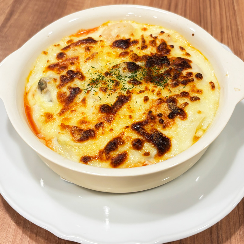 なめらかな特製ベシャメルソースとこだわりの自家製トマトソースをブレンド。海のミネラルと、ビタミンが豊富なホクホクかぼちゃの優しい味わいです。200円でバゲット(ガーリックトースト)1枚つけられます