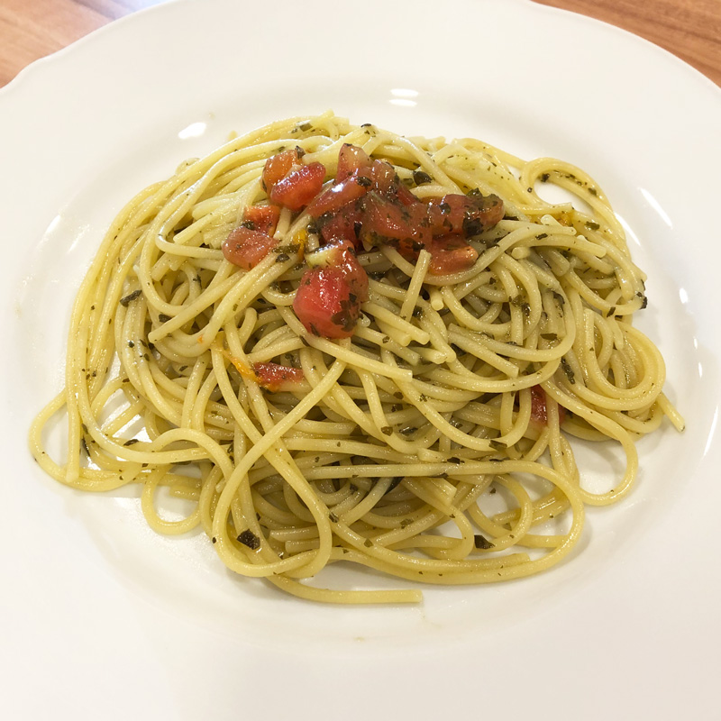 爽やかなバジルのスパゲッティです。あさり、オニオン、マッシュルームが入っています。