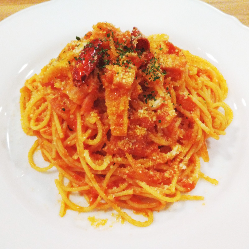 イタリアのアマトリーチェという街の名前からついた、オニオンとベーコンのトマトソースです。パルメザン粉チーズトッピング。